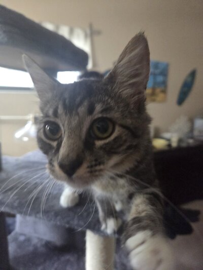 Shroomy is a bit skittish still (except around Hunter - where he will cuddle and sleep on his chest for hours)... but make no mistake, he will let you know when it's time for a food break. Or two.